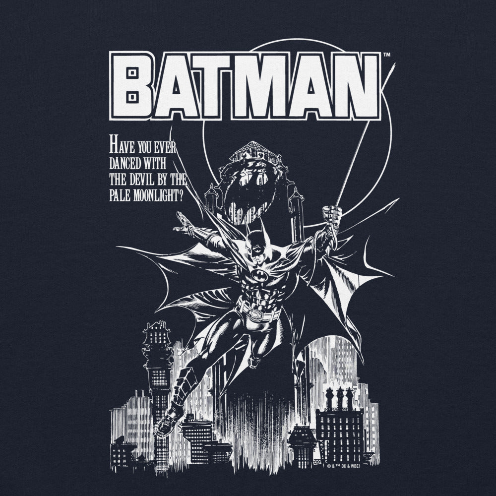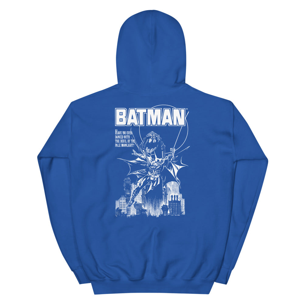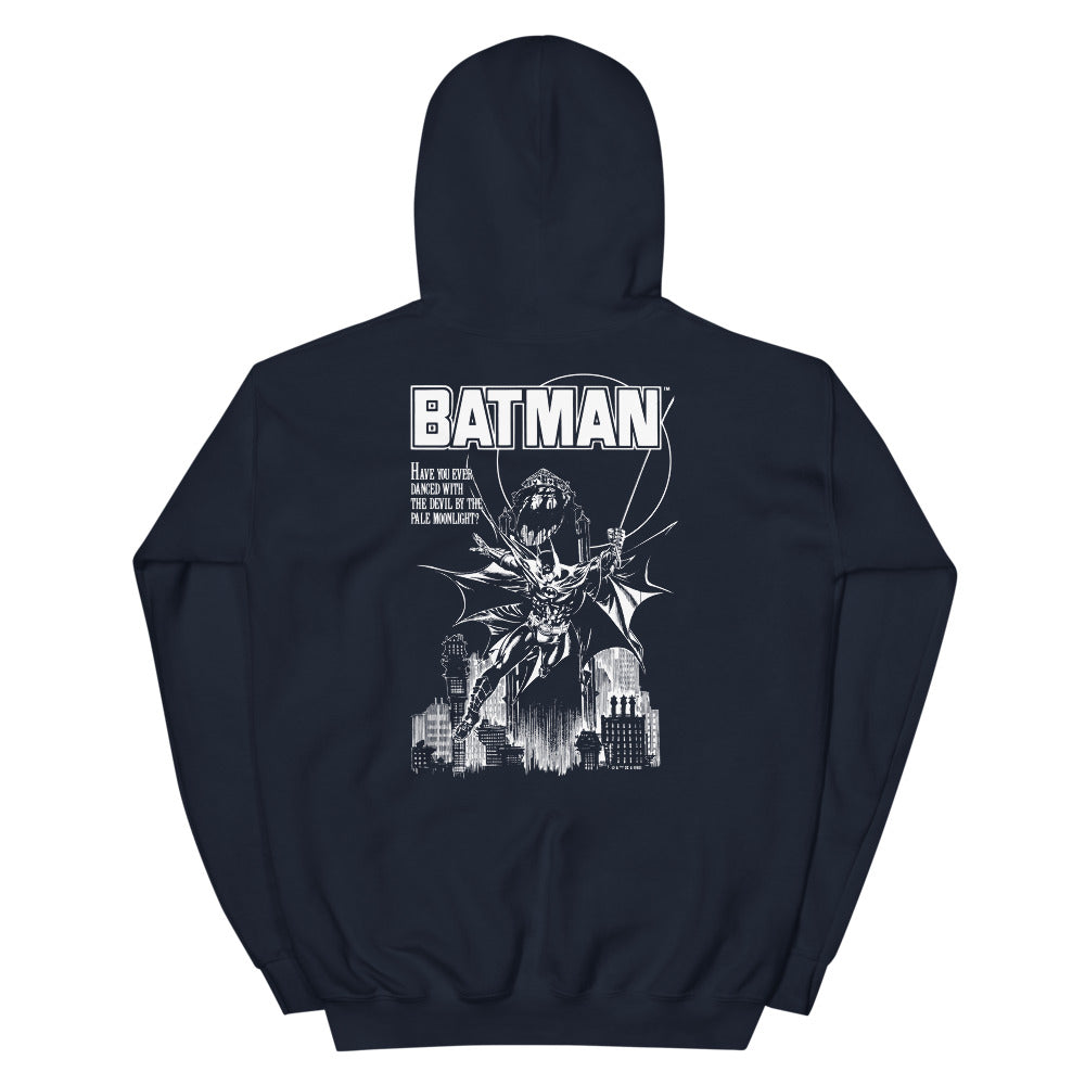 Shall we dance? Batman (1989) logo on front, Batman graphic and quote on back of comfortable and rugged hoodie.