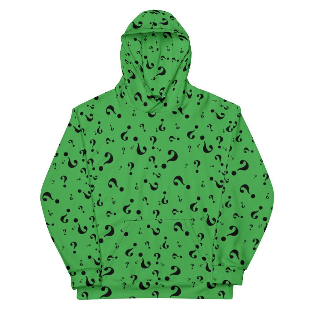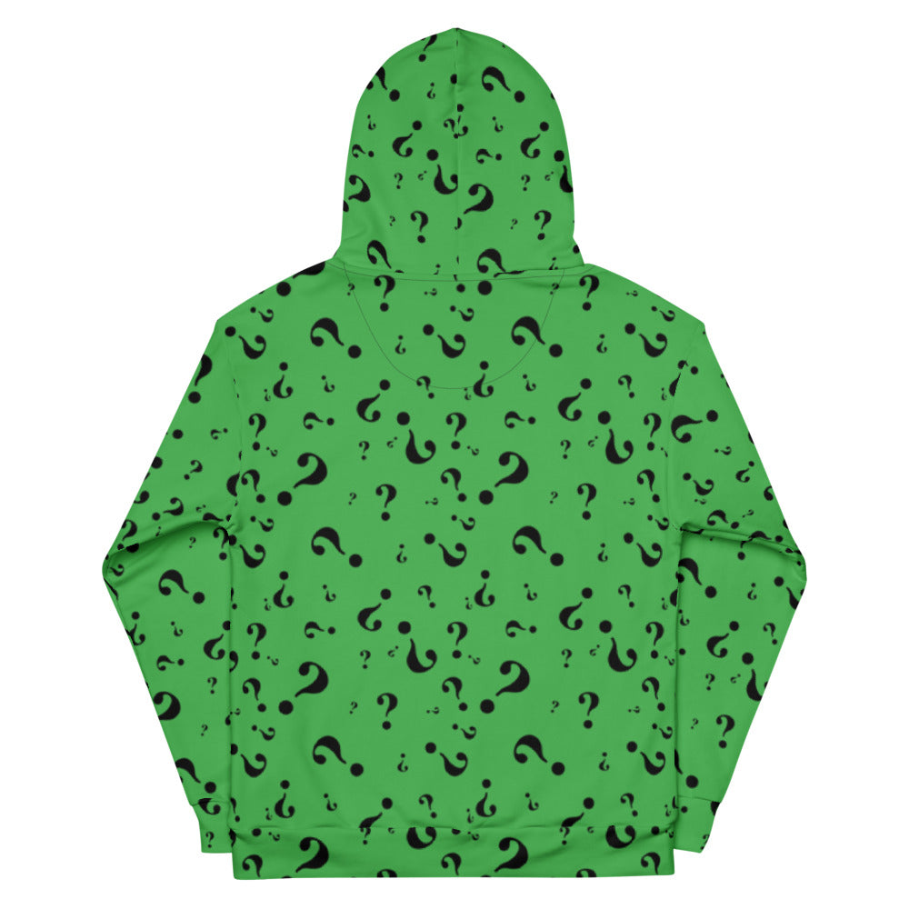 Inspired by Jim Carrey’s unitard from Batman Forever, this bold hoodie is ingeniously designed with a rich green and black print punctuated by the unmistakable sign of Mr. E. Nygma—The Riddler. Relaxed fit, soft cotton-feel fabric, and brushed fleece inside makes this hoodie a no-brainer blend of flair and comfort.