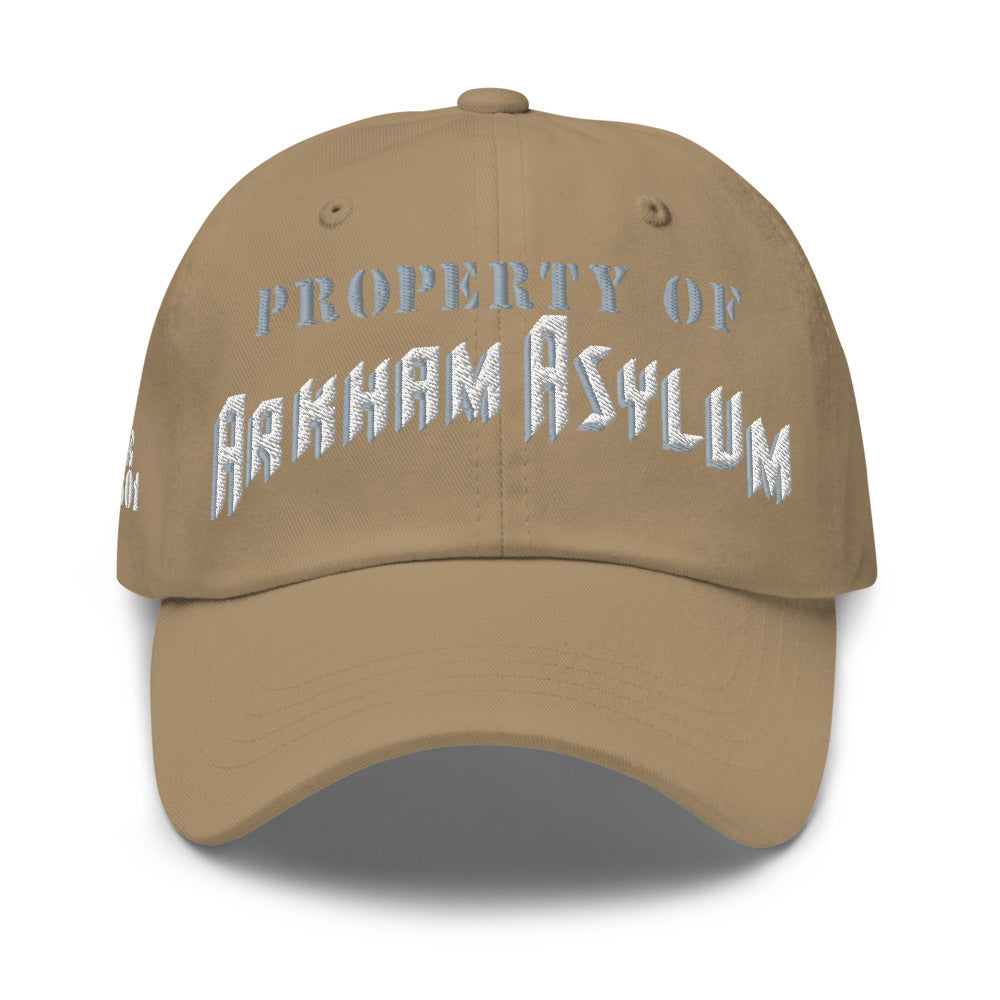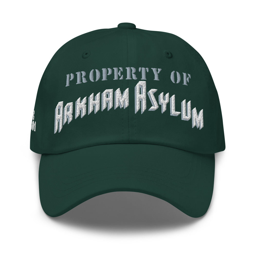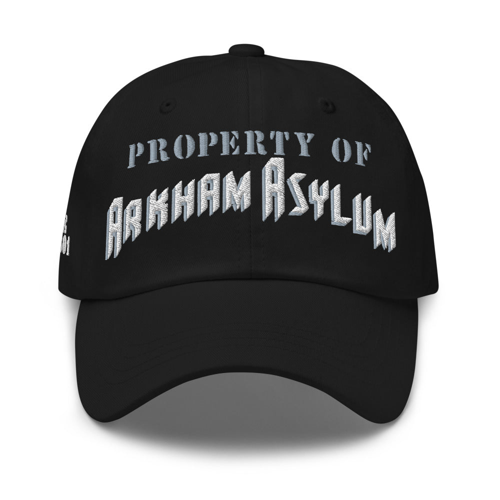 For the Criminally Insane. Classic dad hat features “Property of Arkham Asylum” embroidered up front with “Inmate No. 4219301” on back.