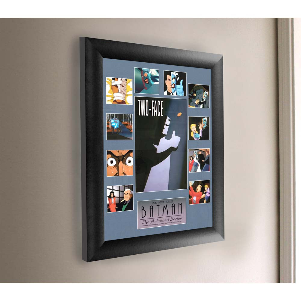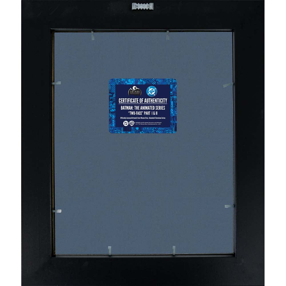 It’s time, Harvey. Its time. A key two-part episode from the first season of Batman: The Animated Series, “Two-Face” is the best of both dramatic storytelling and the “Dark Deco” look that the acclaimed series is known for. Inside the 11” x 13” frame are curated stills from both episodes, capturing the duality of Harvey Dent’s torment, surrounding the “Two-Face” title card centerpiece. Includes Certificate of Authenticity and numbered limited edition Batman: The Animated Series plaque displaying the low collector’s run of only 222 pieces.
