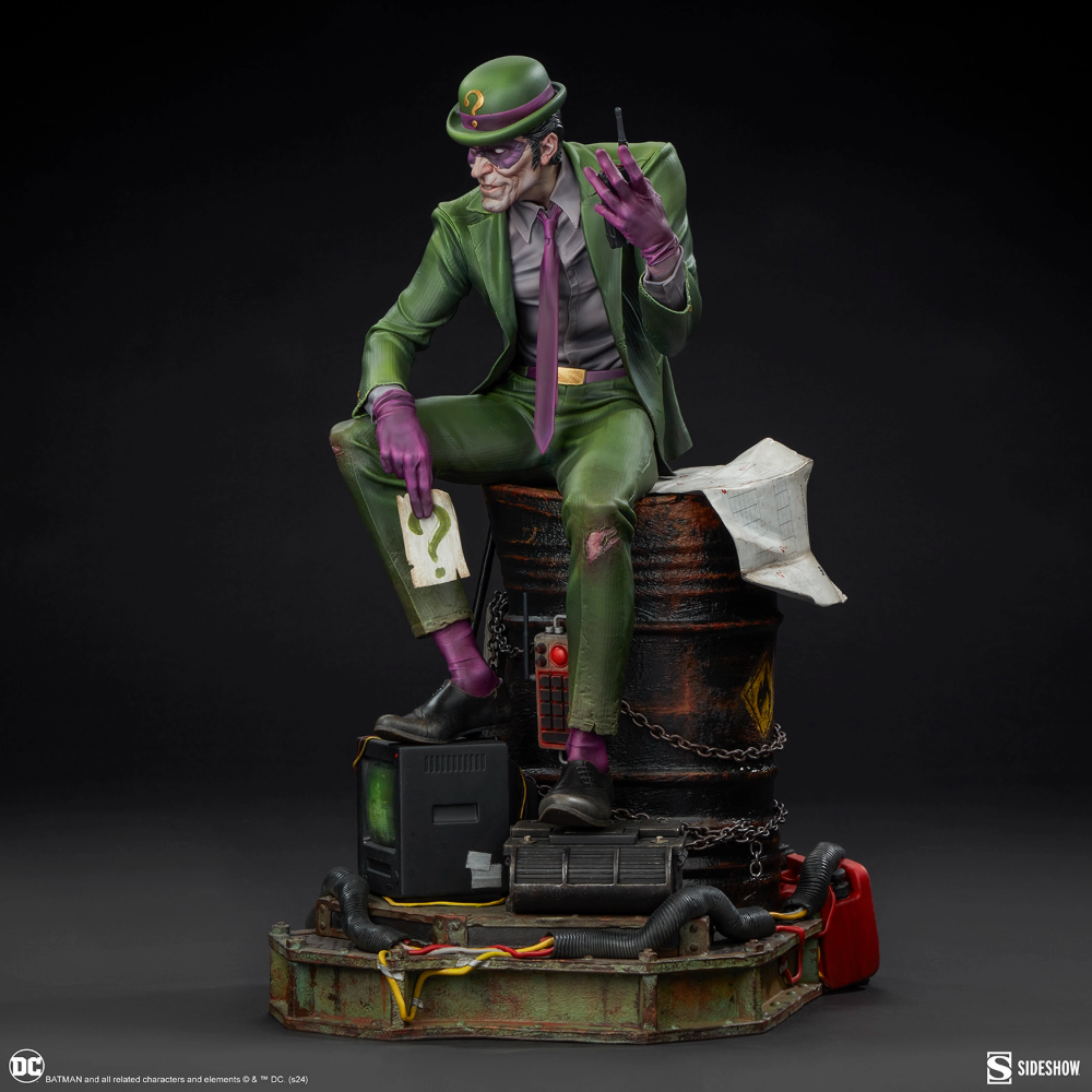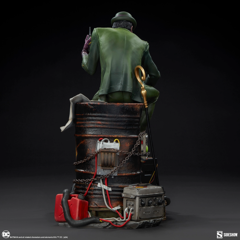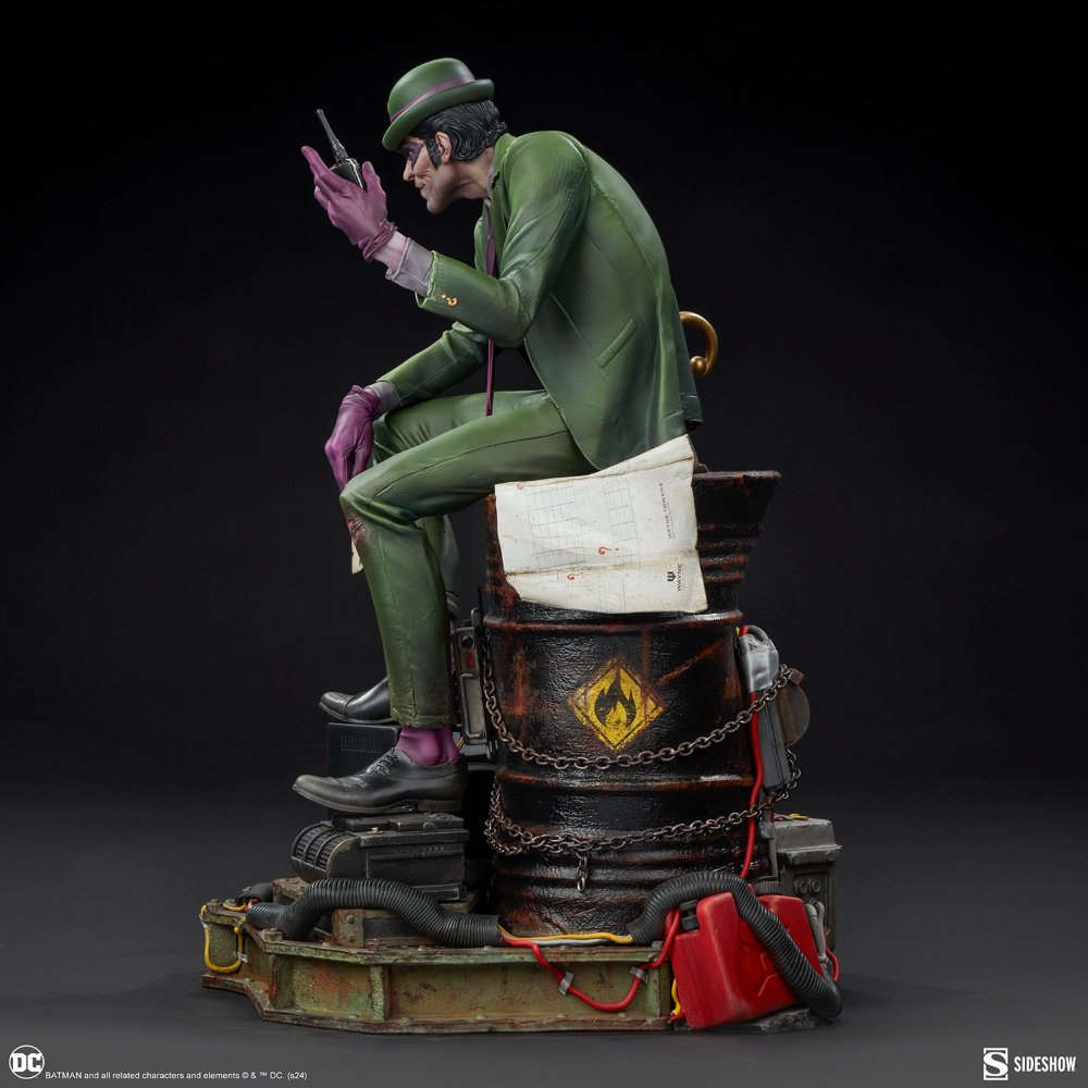 The Riddler Premium Format Figure measures 19.5” tall, 11.8” wide, and 14.3” deep as an egotistical Edward Nygma taunts Batman from atop a lacquered black barrel. Sinewy and sociopathic, the master strategist holds a good old fashioned paper riddle in one hand and a detonator in the other. The Riddler has purposefully put himself front and center in this rusted warehouse. Clues and threats — including Wayne Tower security footage and blueprints, an electronic keypad, a question mark cane, generators, gasoline drums, chains, and wires — are piled high. Now The Riddler's got Batman right where he can see him put together all the puzzle pieces … or die trying.