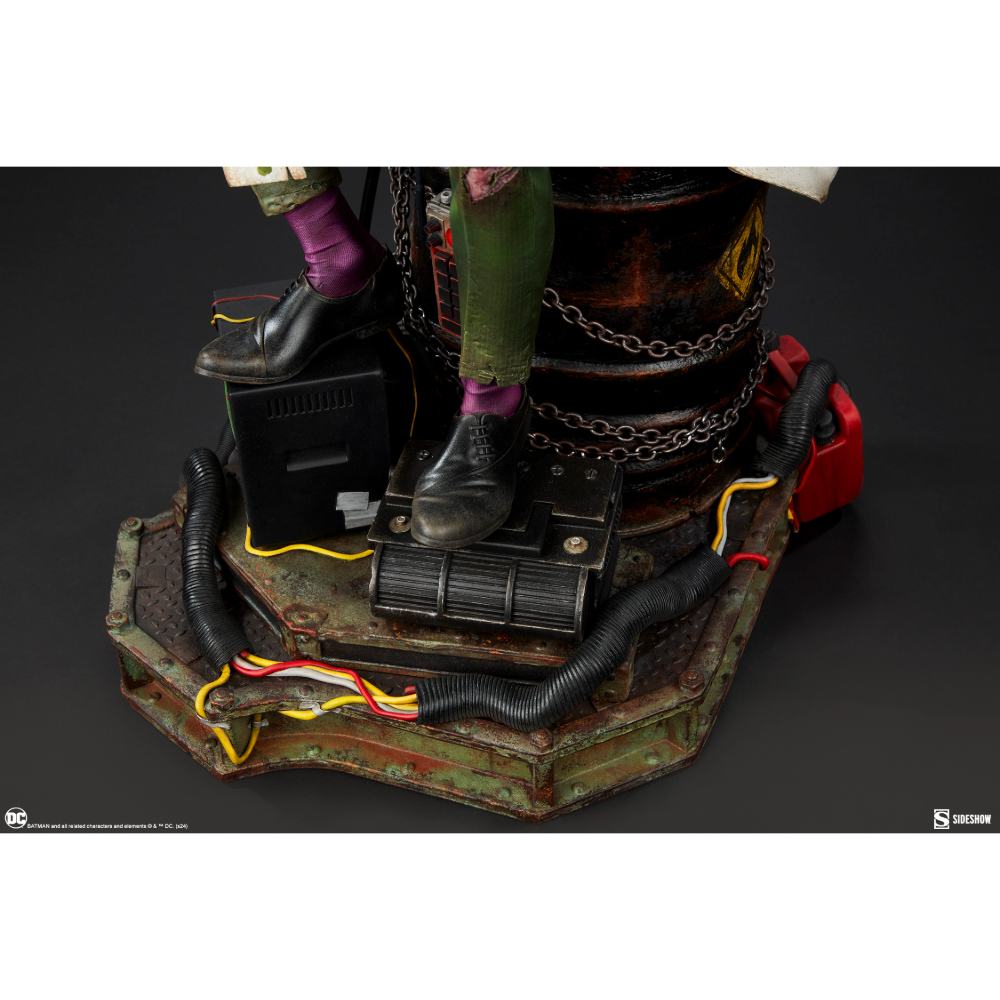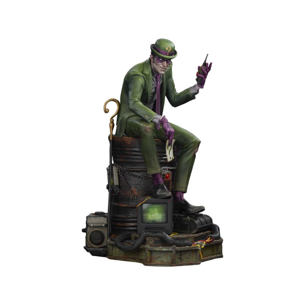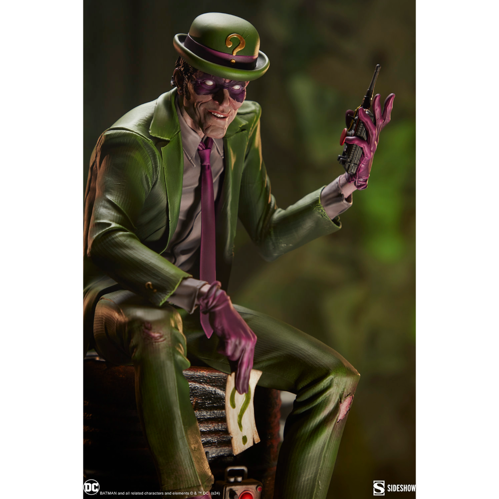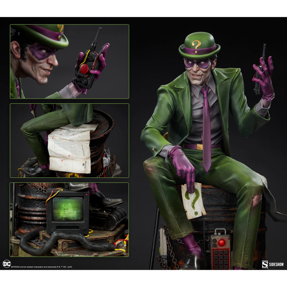 The Riddler Premium Format Figure measures 19.5” tall, 11.8” wide, and 14.3” deep as an egotistical Edward Nygma taunts Batman from atop a lacquered black barrel. Sinewy and sociopathic, the master strategist holds a good old fashioned paper riddle in one hand and a detonator in the other. The Riddler has purposefully put himself front and center in this rusted warehouse. Clues and threats — including Wayne Tower security footage and blueprints, an electronic keypad, a question mark cane, generators, gasoline drums, chains, and wires — are piled high. Now The Riddler's got Batman right where he can see him put together all the puzzle pieces … or die trying.