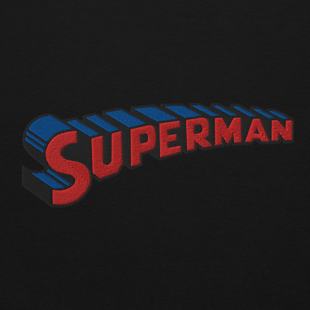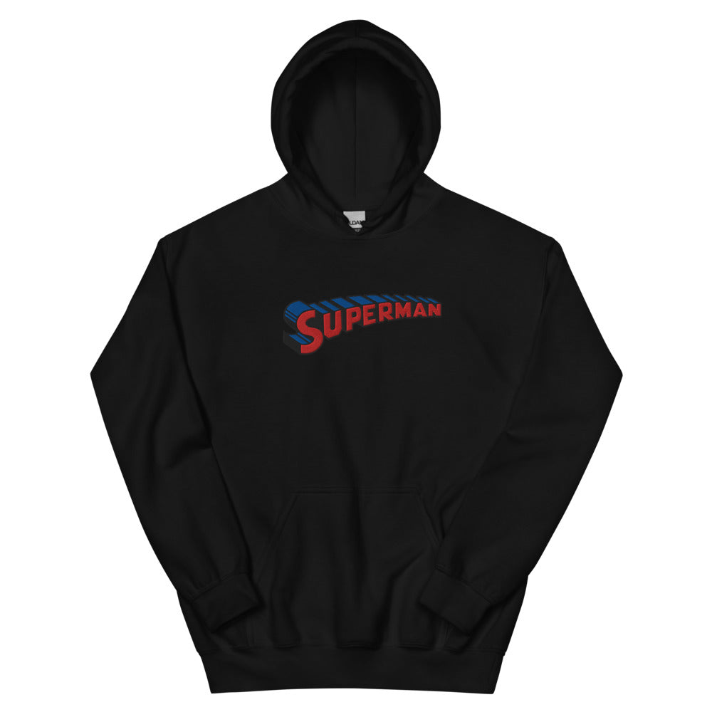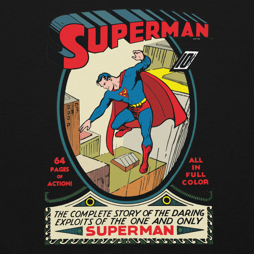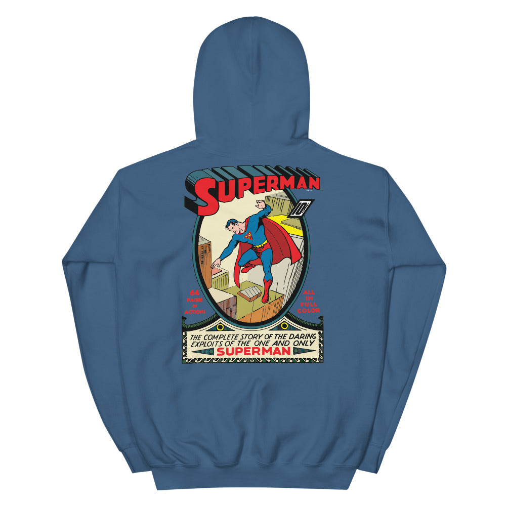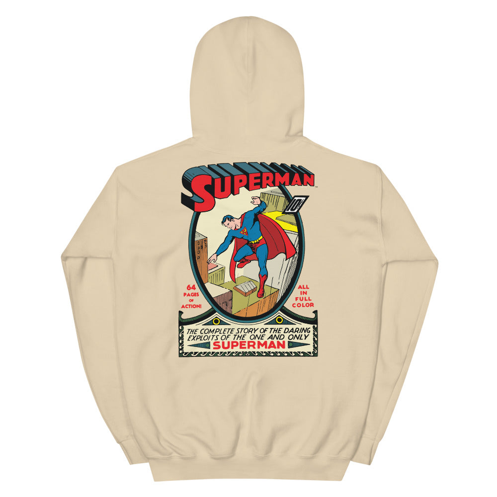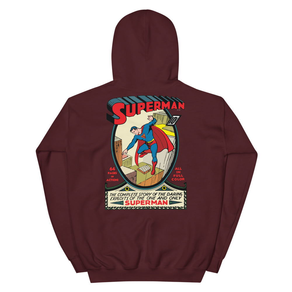 The only and only. “Superman” logo embroidered on front, Joe Shuster’s iconic cover to Superman #1 on back of comfortable and rugged hoodie.