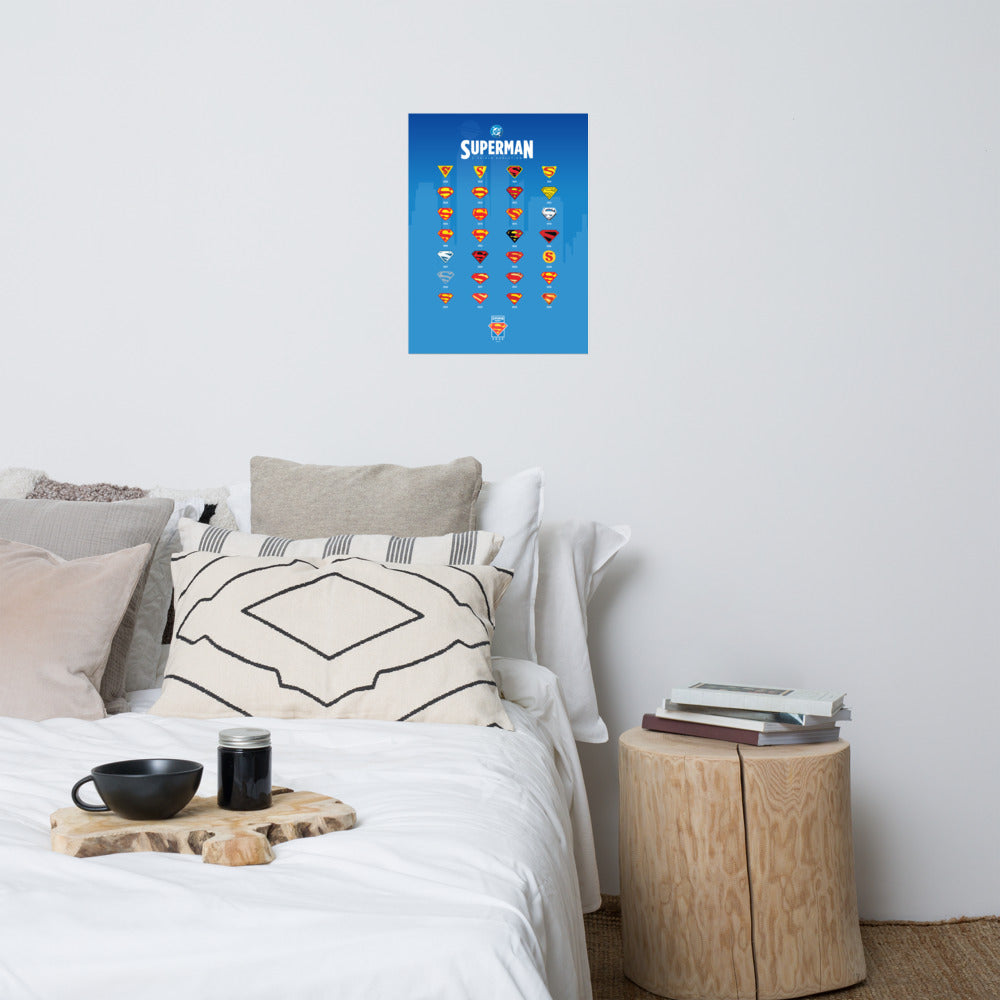 The evolution of an icon. Artwork showcases the many iterations of Superman’s S-Shield, from its humble beginnings in 1938 to its modern form in 2025. Printed on luster paper, mix of gloss and matte finish. A unique piece for any Superman enthusiast.