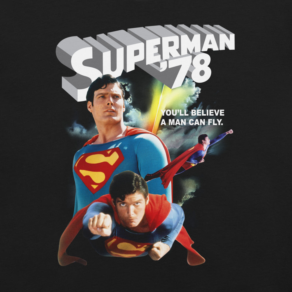 A heroic stranger from the stars. Tee features photomontage of Christopher Reeve as the amazing Man of Steel, the movie’s tagline “You’ll Believe a Man Can Fly" with “Superman ’78.”