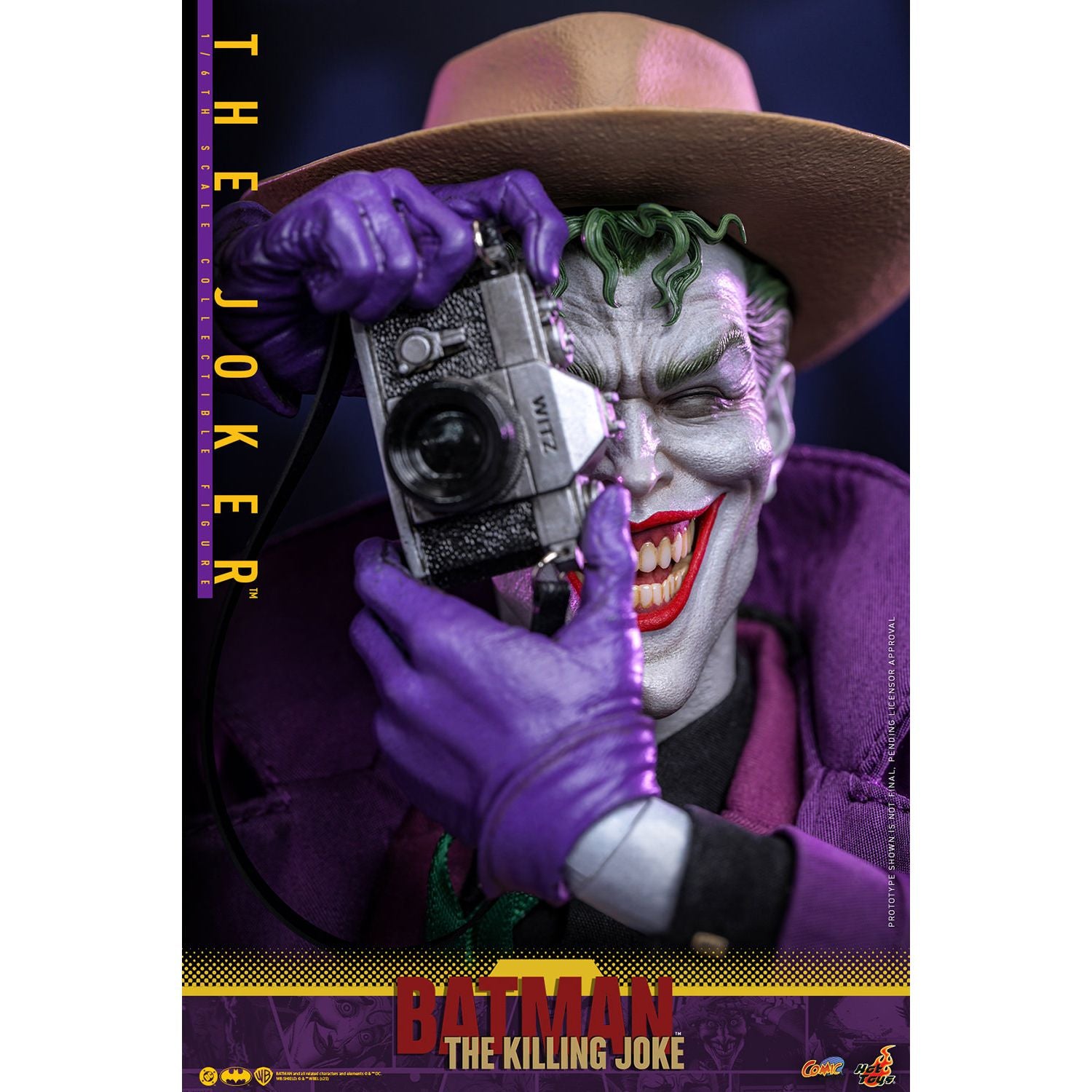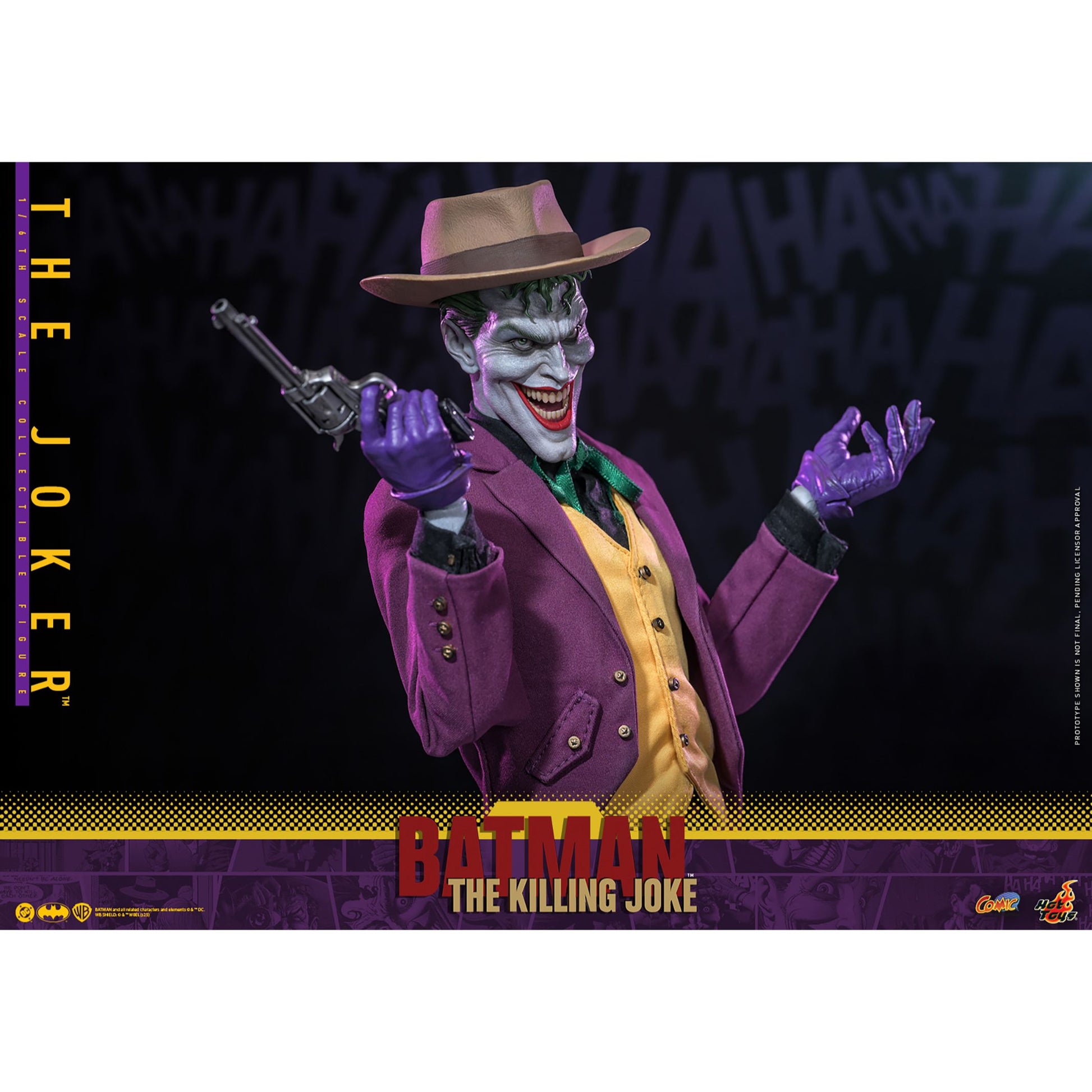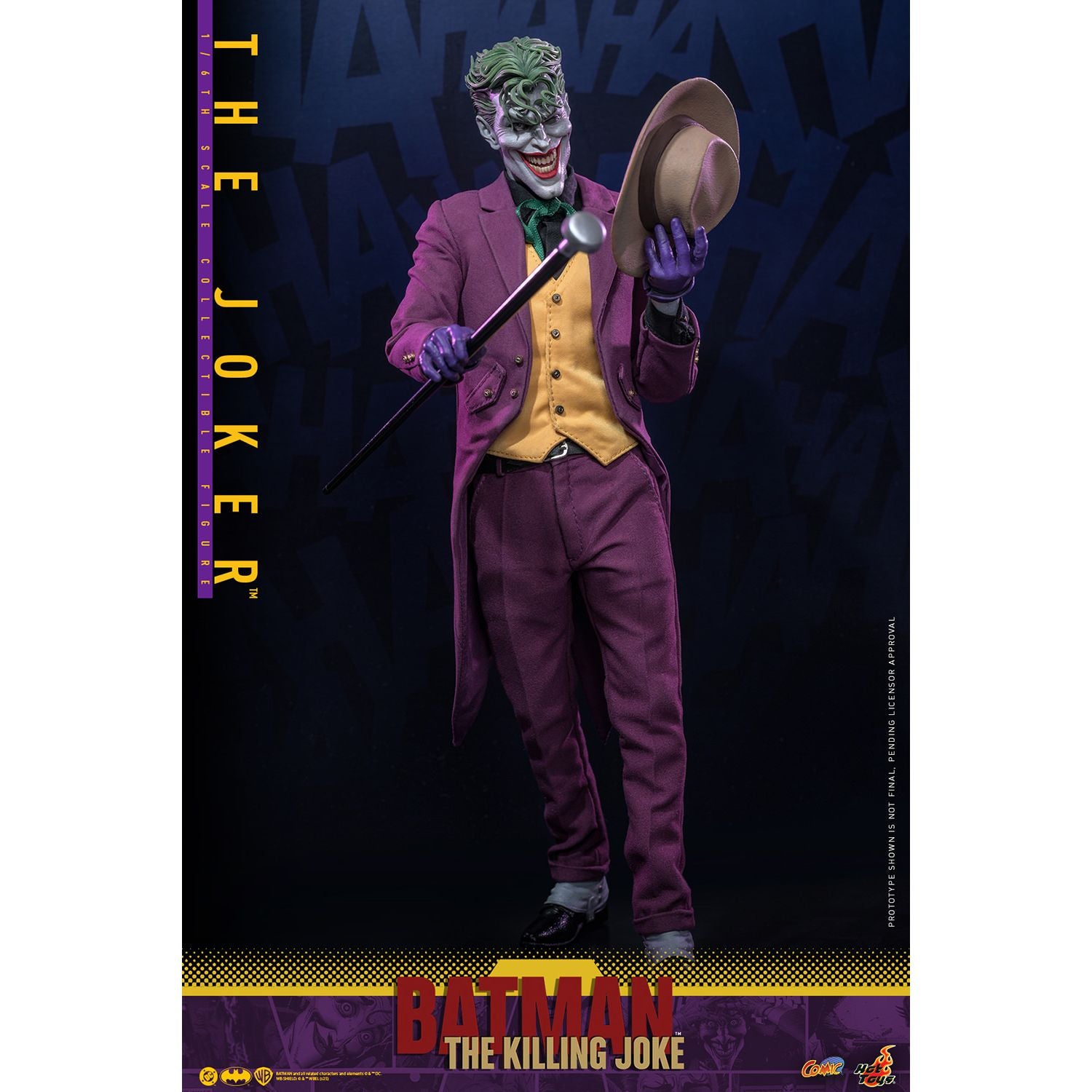 Sideshow and Hot Toys is proud to present the The Joker Sixth Scale Collectible Figure, inspired by the comic Batman: The Killing Joke. The action figure includes two newly developed head sculpts equipped with rolling eyeballs, detailed wrinkles, make-up, and meticulously sculpted curly green hair that completes the haunting visage. One head sculpt features an open-mouth grinning expression, with a magnetically attachable tongue; the other has a winking and grinning expression, with a removable hat that is interchangeable with both head sculpts. The Joker is dressed in his comic-accurate attire, coming with a wire-embedded purple coat and jacket over a yellow waistcoat, black shirt, green ribbon, black belt, and purple pants paired with black shoes. Coming with eight interchangeable gloved hands, collectors are able to pose him with his iconic expressive poses. True to the original panels, his weapons come with a small knife and a pistol that shoots a “Click Click Click” flag. Also included are a camera, a cane, and a Joker card. Completing the setup is a backdrop featuring the comic cover art of Batman: The Killing Joke, which is mountable to the specially designed figure stand.