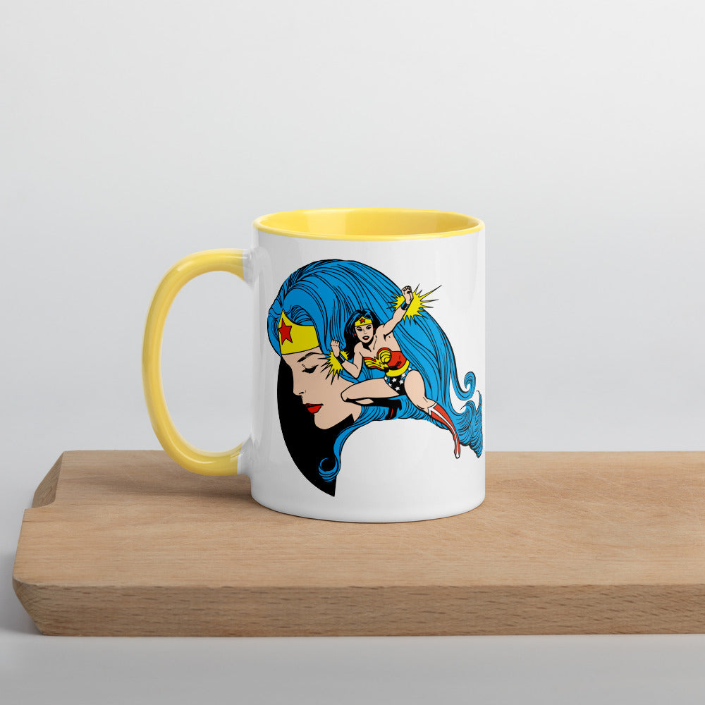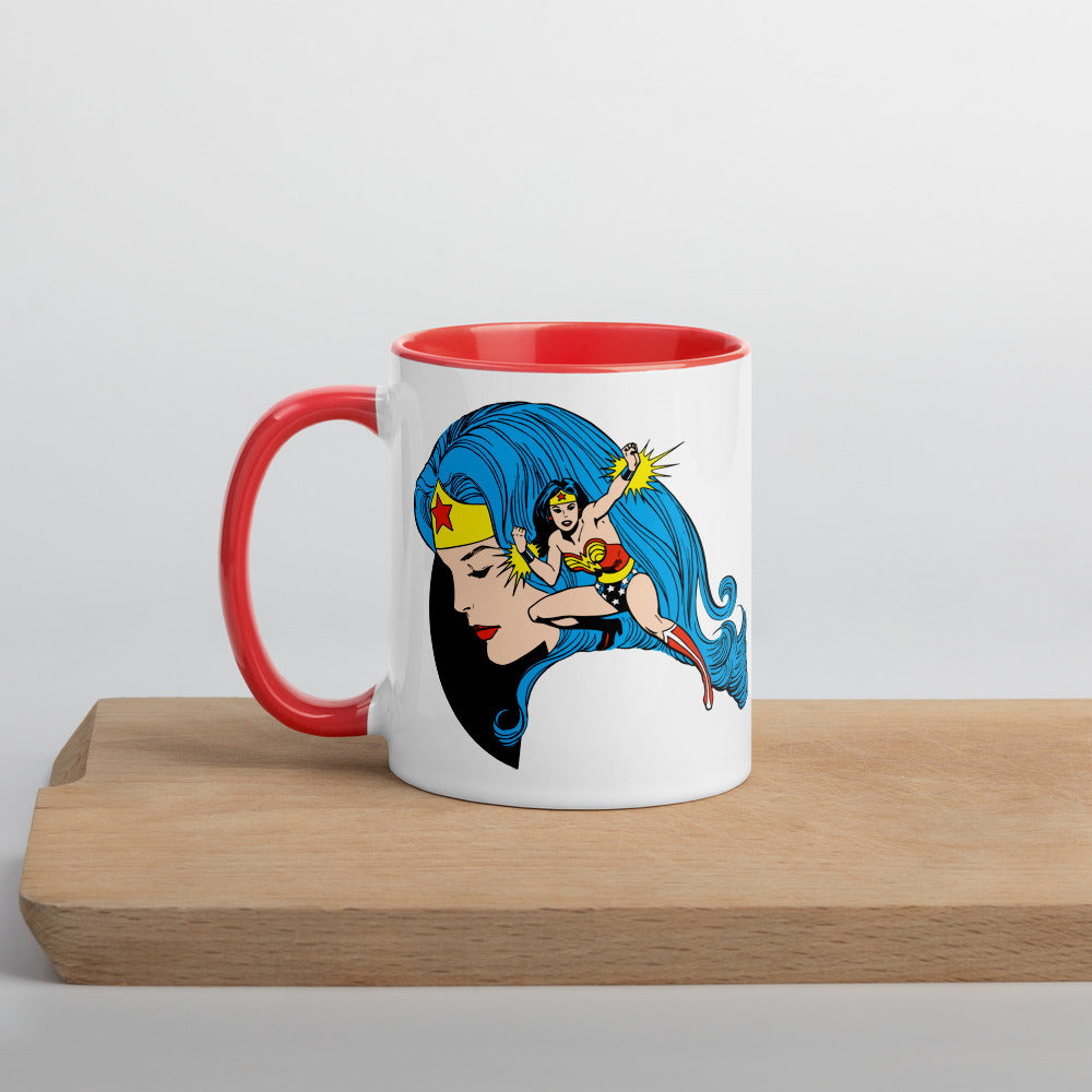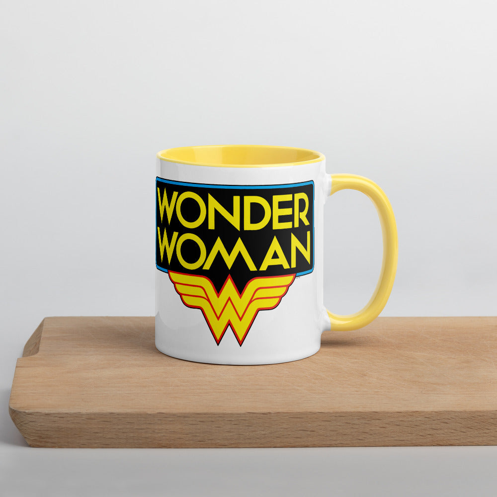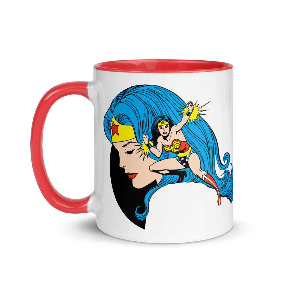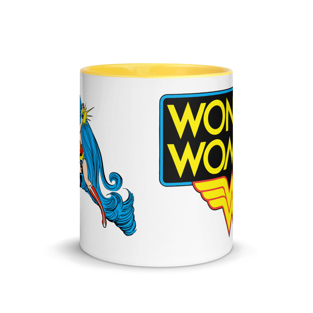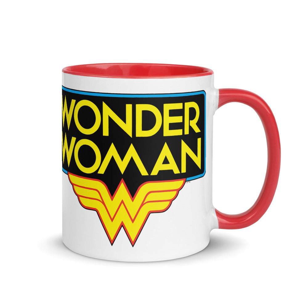 Add a touch of Amazonian empowerment to your beverage. 11 oz. ceramic two-tone mug with vintage image of Wonder Woman on one side, Bronze Age logo on reverse.